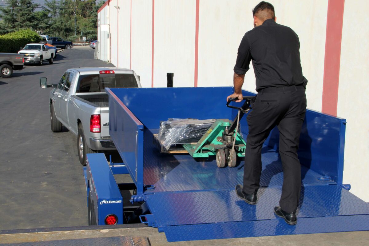 The multi-purpose, one-of-a-kind, “DH10 – Drop-Deck & Dock-Loading” trailer from Airtow adds new heights to your equipment deliveries and is the most versatile and dependable trailer available today. With an easy-to-use hydraulic system and 8000 lbs. of load capacity, it’s everything Airtow customers have come to love with the added benefit of 60″ dock height loading.